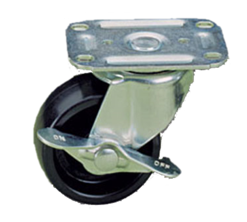 Caster, light duty, swivel, 2-3/4" x 3-3/4" plate, 3" diameter, no ball bearing, side brake, 100 lb. load capacity, black polyolefin wheel