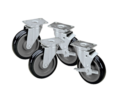 Caster Pack, 2-3/8" X 3-5/8" swivel plate, medium duty, 5" diameter, 250 lb. load capacity each, black polyolefin wheel, 2 swivel/2 brake, NSF