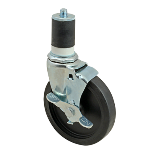 Caster, swivel stem, standard duty, 15/16"W, 5" dia., Ball Bearing, swivel, for 1-5/8" OD tubing with brake, non-marking black polyolefin wheel with black plastic hub