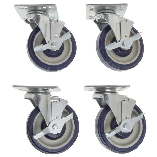 Caster Kit, 5" dia., 300 lb. capacity per caster, swivel, 4" x 4" universal plate, with side lock friction brake, grease-resistant, non-marking, zinc-plated steel/polyurethane, blue (4 each per kit)