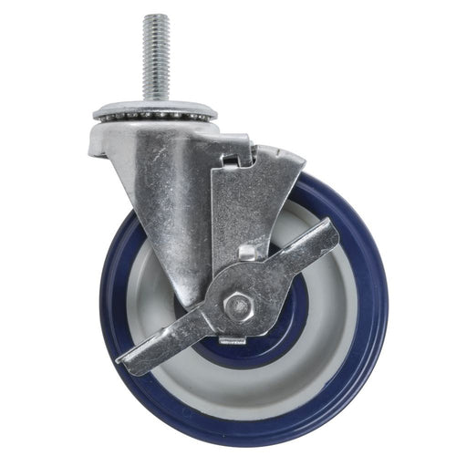 Caster, 5" dia., 200 lb. capacity, 1-1/2" x 7/16" threaded swivel stem, with side lock friction brake, grease-resistant, non-marking, zinc-plated steel/polyurethane, blue