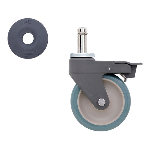 Super Erecta® Stem Caster, swivel (with foot operated brake), 5" dia., 1-1/4" face, 300 lb. capacity, corrosion resistant, antimicrobial polyurethane flat wheel tread, polymer horn, includes bumper