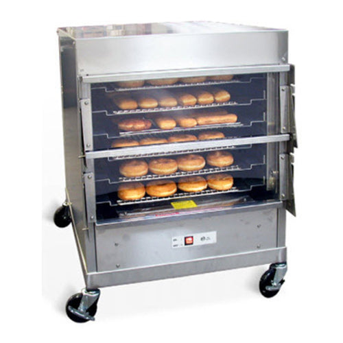 (20218) Proofer Cabinet, mobile, half height, non-insulated, 28"W x 28"D x 31" H, (2) clear plexiglass doors, (6) shelves, accepts screens or pans, 17” x 25”, 18” x 26", 23” x 23” or 24” x 24”, blower system, temperature gauge, thermostat-controlled, manual fill bottom mount heat/humidity unit, non-insulated, stainless steel & aluminum construction, (4) casters, (2 locking), 2.4 kW, 208v/60/1-ph, 11 amps, ETL, ETL-Sanitation