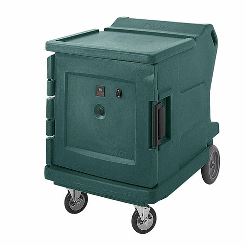 Camtherm® Hot/Cold Cart, 30-1/2"W x 42"D x 42-3/8"H, electric, low profile, single door, holds (11) 18 X 26 sheet pans (requires five additional rail sets), (12) 12" x 20" x 2-1/2" deep food pans, (8) 12" x 20" x 4" deep food pans, (6) 12" x 20" x 6" deep food pans, or (4) 12" x 20" x 8" deep food pans, temperature control dial, on-off power switch, adjustable chrome plated steel slide rail, Celsius solar digital thermometer, molded-in handles & bumpers, nylon door latches, serving top, menu clip, (2) 6" front swivel casters with brakes & (2) 10" rear casters, 9' cord with plug, granite green, 110v/50/60/1-ph, 1162 watts, 10.7 amps, NEMA 5-15P, NSF, ENERGY STAR®, cETLus