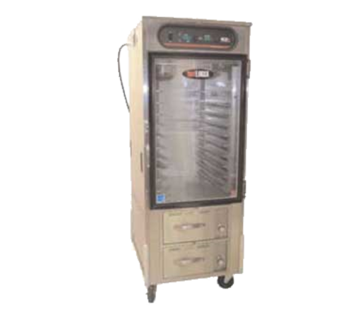hotLOGIX Dual Humidified Holding Cabinet with Drawer Warmer-HL10 Series, one compartment, full height, insulated, (20) 12" x 20" or (10) 18" x 26" pan capacity, universal slides, (1) solid field reversible door, 2-drawer warmer at base of cabinet, top-mount forced air heat, electronic controls, stainless steel construction, (4) 5" swivel casters (2 with brakes), cULus, UL EPH Classified