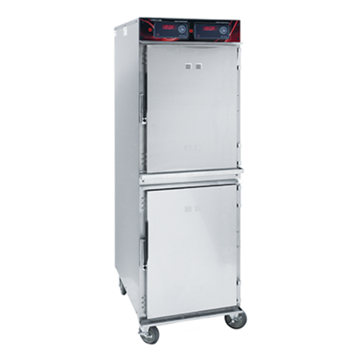 Heated Cabinet, Mobile, two compartment, radiant, insulated, top-mount heater assembly, (16) 18" x 26" or (32) 12" x 20" pan capacity, adjustable pan slides on 1-1/2" centers, (2) independent deluxe solid state electronic controls, LED digital displays, field reversible dutch doors, magnetic anti-microbial latches, stainless steel construction, (4) 5" swivel casters (2) with brakes, CSA-Sanitation, cCSAus
