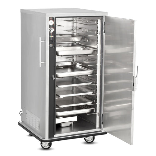 Heated Cabinet, mobile, (10) universal tray slides, (10) 18" x 26" or (20) 12" x 20" pan capacity, 4-1/2" OC, adjustable on 1-1/2" increments, Humi-temp heat & humidity system, adjustable thermostat, individual controls, insulated, removable humidifier pan, (1) flush mounted door, edgemount door latch, push bar handles, wraparound bumper, stainless steel interior & exterior, 5" casters (2) rigid & (2) swivel with brakes, NSF, CE, cULus, UL, IPX4