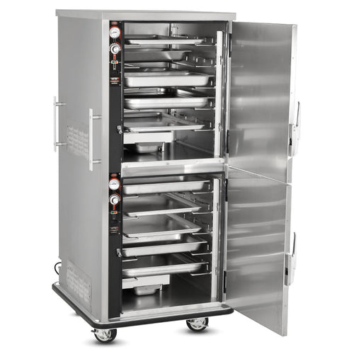 Heated Cabinet, mobile, split cavity, (5) universal tray slides per cavity, (5) 18" x 26" or (10) 12" x 20" pan capacity per compartment, 4-1/2" OC, adjustable on 1-1/2" increments, Humi-temp heat & humidity system, adjustable thermostat, separate controls, insulated, removable humidifier pan, (2) flush mounted doors, edgemount door latches, push bar handles, wraparound bumper, stainless steel interior & exterior, 5" casters (2) rigid & (2) swivel with brakes, NSF, CE, cULus, UL, IPX4