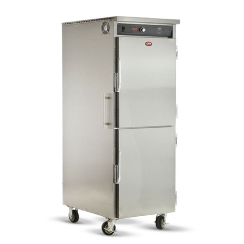 Heated Cabinet, mobile, slim-line, high output, (13) pair universal tray slides, (13) 18" x 26" or (26) 12" x 20" pan capacity, 4-1/2" OC, adjustable to 1-1/2" increments, top mounted forced air heating system, adjustable thermostat, 90°F to 240°F temperature range, insulated, (2) Dutch doors, push bars, wraparound bumper, stainless steel construction, 5" casters (2) rigid & (2) swivel with brakes, UL, cULus, UL EPH Classified, CE, IPX4