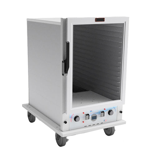 Economy Proofer Cabinet, non-insulated, mobile, half height, clear polycarbonate door with hinge on right, capacity (14) 18" x 26" pans, 1-1/2" spacing, digital thermometer adjustable up to 160°F, independent temperature/humidity controls, removable heat unit, aluminum construction, 5" swivel casters (2 braked), 120v/60/1-ph, 1500 watts, ETL (All cabinets that are less than full size are considered custom & non returnable but fully warranted)