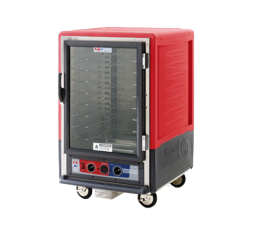 C5™ 3 Series Heated Holding Cabinet, lower wattage, with Red Insulation Armour™, mobile, half height, insulated, clear polycarbonate door, removable bottom mount control module, thermostat to 200°F, fixed wire slides on 3" centers (8) 18" x 26" or (16) 12" x 20" x 2-1/2" pan capacity, 5" casters (2 with brakes), aluminum, 120v/60/1-ph, 1440 watts, 12 amps, NEMA 5-15P, cULus, NSF