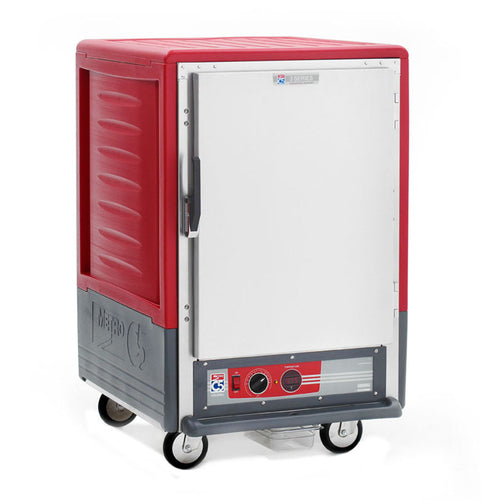 C5™ 3 Series Heated Holding Cabinet, lower wattage, with Red Insulation Armour™, mobile, half height, insulated cabinet & door, removable bottom mount control module, thermostat to 200°F, fixed wire slides on 3" centers (8) 18" x 26" or (16) 12" x 20" x 2-1/2" pan capacity, 5" casters (2 with brakes), aluminum, 120v/60/1-ph, 1440 watts, 12 amps, NEMA 5-15P, cULus, NSF
