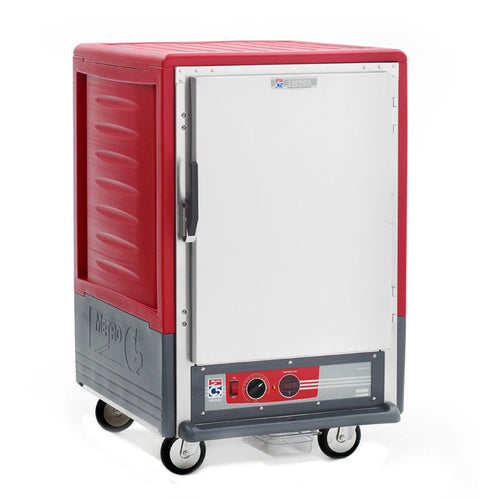 C5™ 3 Series Heated Holding Cabinet, lower wattage, with Red Insulation Armour™, mobile, half height, insulated cabinet & door, removable bottom mount control module, thermostat to 200°F, universal wire slides on 3" centers, adjustable on 1-1/2" increments (8) 18" x 26" or (16) 12" x 20" x 2-1/2" pan capacity, 5" casters (2 with brakes), aluminum, 120v/60/1-ph, 1440 watts, 12 amps, NEMA 5-15P, cULus, NSF