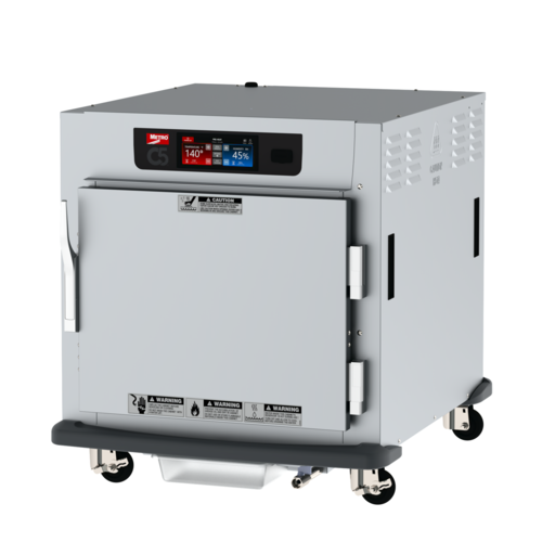 C5™ 9 Series Controlled Humidity Heated Holding and Proofing Cabinet with 6.8" touch-screen controls, mobile, undercounter, insulated solid door, lip load slides, capacity (10) 18" x 26" pans, 1-1/2" O.C., stainless steel, 3" casters, polymer bumper & drip trough combination, 120v/60/1-ph, 1440 watts, 12 amps, NEMA 5-15P, cULus, NSF, Made in USA
