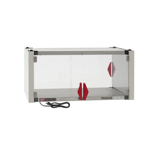 Super Erecta® Hot Enclosed Heated Shelf Kit, includes: (1) 36"W x 24"D heated shelf, with powdercoated side panels, clear polycarbonate sliding front doors, clear hinged rear doors, adjustable thermostat to 200°F max temperature, (1) non-heated, stainless steel top shelf, (4) split sleeves, 120v/60/1-ph, 400 watts, 3.4 amps, cord & NEMA 5-15P, NSF, cULus, Made in USA