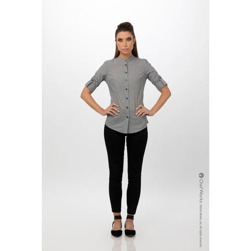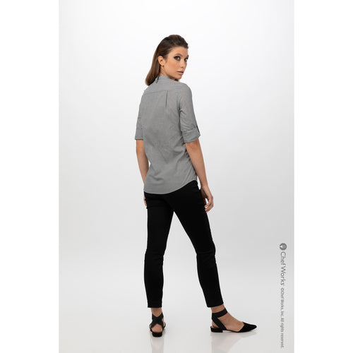 Women's Verismo Dress Shirt, roll-up long sleeves with button tab, adjustable cuffs, banded collar with back of collar apron holder, button front, thin-stripe fabric, 62/38 cotton/poly, black, XS