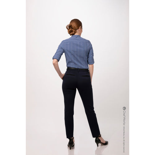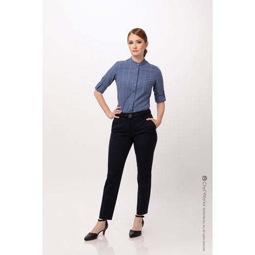Women's Voce Dress Shirt, roll-up long sleeves with button tab, adjustable cuffs, banded collar with back of collar apron holder, darted front, back yoke with darts, button front, wide-stripe fabric, 60/40 cotton/poly, blue, large