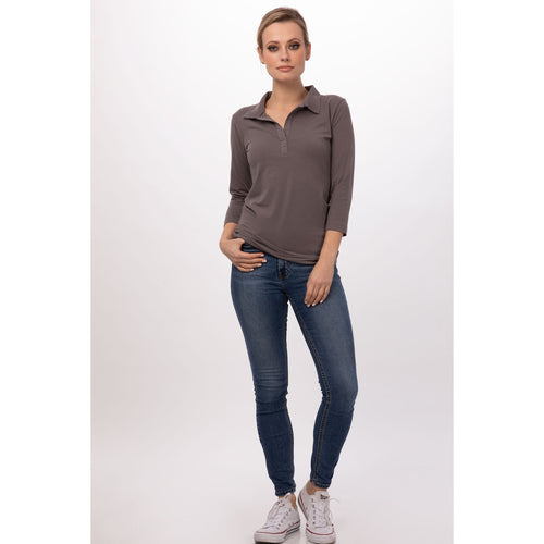 Women's Definity Shirt, 3/4 sleeves, v-neck polo, straight hem, double needle stitching, 57/38/5 cotton/poly, elastane blend, mushroom, 2XL