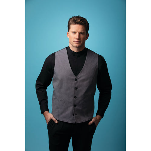 Men's Bridge Vest, v-neck, half lined, button front closure (closes left to right), (1) inner pen pocket & (2) front welt pockets, back ties with adjustable slider, stretch back insert, 65/35 poly/cotton, light gray, large