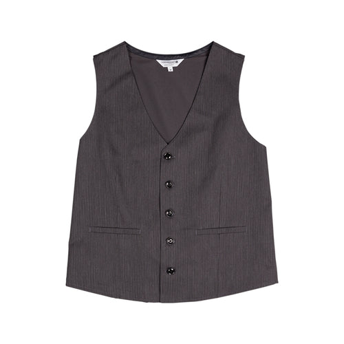 Men's Bridge Vest, v-neck, half lined, button front closure (closes left to right), (1) inner pen pocket & (2) front welt pockets, back ties with adjustable slider, stretch back insert, 65/35 poly/cotton, pinstripe, small
