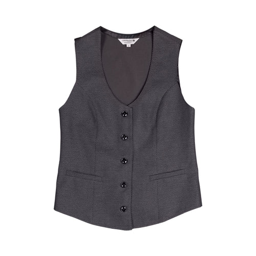 Women's Bridge Vest, v-neck, half lined, button front closure (closes right to left), (1) inner pen pocket & (2) front welt pockets, back ties with adjustable slider, stretch back insert, 65/35 poly/cotton, gray diamond, medium