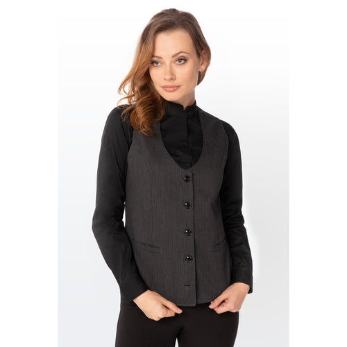 Women's Bridge Vest, v-neck, half lined, button front closure (closes right to left), (1) inner pen pocket & (2) front welt pockets, back ties with adjustable slider, stretch back insert, 65/35 poly/cotton, pinstripe, 3XL