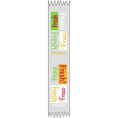 Merchandising Food Tape, "Fresh/Fresco/Frais", 1" x 500' roll, tri-lingual (English/Spanish/French), tamper-resistant seal, plastic, multi-color imprinted, clear background