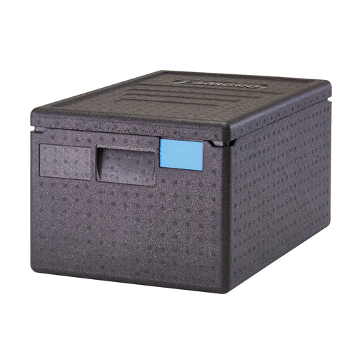 Cam GoBox® Insulated Food Pan Carrier, 48.6 qt., top load, holds (1) GN 1/1 or (2) GN 1/2 sized food pans up to 8" deep, ergonomic handles, maintains safe temperature for hot or cold holding for up to 4 hours, dishwasher safe, drip resistant, stackable, lightweight, impact resistant, eco-friendly, 100% recyclable, EPP (expanded polypropylene foam), black