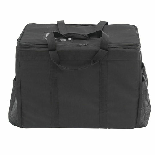 Catering Delivery Bag, 23" x 14" x 17", holds (2) 6" deep, (4) 4" deep, or (6) 2-1/2" deep full size pans, multi-use, top load, zipper lid closure, (2) outside end pockets, hardboard bottom, insulated, removable sliver coated PVC interior, imitation nylon, black