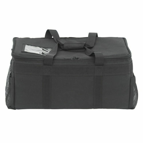 Takeout Delivery Bag, 21" x 11" x 10", holds (6-10) meal containers, multi-use, top load, zipper lid closure, (2) outside end pockets, hardboard bottom, insulated, white PVC interior, imitation nylon, black