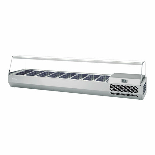 Ingredient Display Case, refrigerated, countertop, 77-7/8" long, 2.36 cu. ft. capacity, lift up glass lid, includes (8) 1/3 stainless steel pans, self-contained refrigeration, digital controller, 300 series stainless steel interior & exterior, 1/6 HP, cETLus, ETL-Sanitation