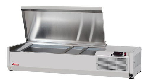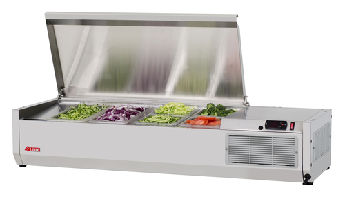 E-Line Countertop Salad Table, 47-1/4"L, side mounted self-contained refrigeration, accommodates (8) GN 1/6 size or (4) GN 1/3 size 6″ deep condiment pans (pans not included), digital temperature display on front panel, static cooling system, R290 Hydrocarbon refrigerant, stainless steel interior & exterior, 1/6 HP, 115v/60/1-ph, 2 amps, NEMA 5-15P, cETLus, ETL-Sanitation (contact sales for lead time)