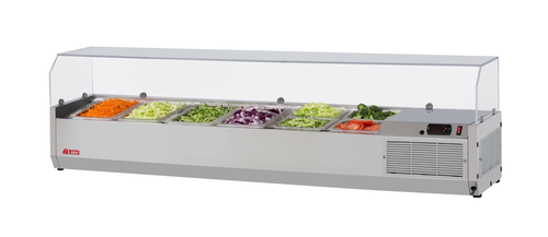 E-Line Countertop Salad Table, with clear hood, 60-1/4"L, side mounted self-contained refrigeration, accommodates (7) GN 1/4 size x 6" deep condiment pans (pans not included), digital temperature display on front panel, static cooling system, R290 Hydrocarbon refrigerant, stainless steel interior & exterior, 1/6 HP, 115v/60/1-ph, 1.3 amps, NEMA 5-15P, cETLus, ETL-Sanitation (contact sales for lead time)