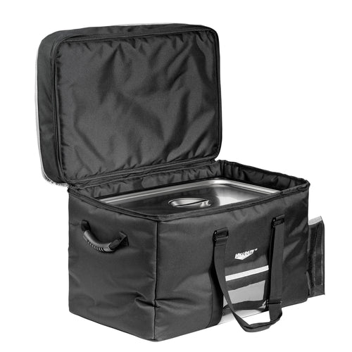 Medium Catering Bag, 1-Series, 17"W x 13"D x 13"H, holds up to (3) half-size 4" deep food pans or (12) large beverages, reinforced stitching, 2" thick insulation, moisture-resistant outer shell material, carrying straps, sturdy bottom, durable zipper closures with fold-over flap, polyester lining, collapsible for easy storage, PVC window pocket holds branding, order slips, menus, or brochures, expandable side pocket can hold up to (2) 2-liter bottles as well napkins & disposables, reflective piping for safer nighttime delivery