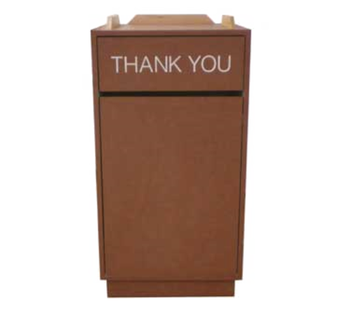 Trash Receptacle, swing door with "Thank You" stenciled in white, includes 35 gallon rigid liner, 1” thick high impact melamine
