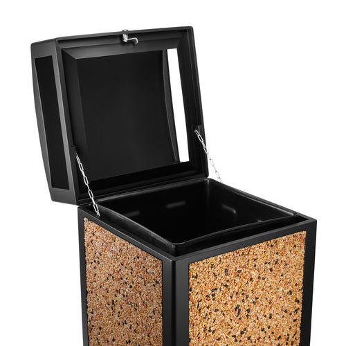 All Weather Trash Container, 40 gal., 21" x 21" x 41-1/3"H, leak proof plastic insert, lid with lock & key, powder coated steel frame and lid, rugged, weather resistant, adjustable legs for uneven surfaces, stone decorative panels