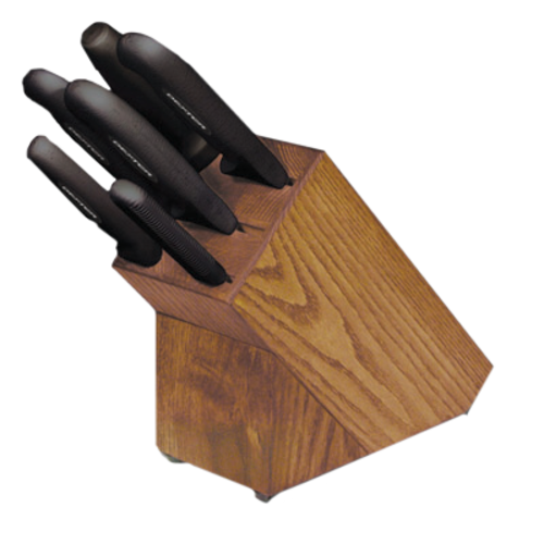 SofGrip™ (21009) Knife Block Set, 7 piece, includes: 10" diamond knife sharpener, 8" chef's/cook's knife, 6" narrow boning knife, 8" scalloped bread slicer, 6" scalloped utility knife, 3-1/4" paring knife, and wood slanted block, stain-free, high-carbon steel, black, soft rubber, handles