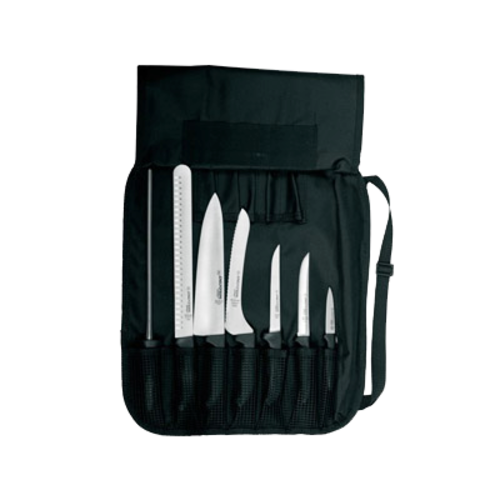SofGrip™ (20713) Professional Cutlery Set, 7 piece, includes: 3-1/4" paring knife, 6" narrow boning knife, 6" scalloped utility knife, 9" scalloped offset slicer, 10" chef's/cook's knife, 12" duo-edge roast slicer, 12" diamond steel, cutlery case, stain-free, high-carbon steels, black handles