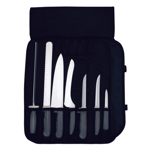 Sani-Safe® (20703) Cutlery Set, 7 piece, includes (1) each: 12" diamond knife sharpener, 12" duo-edge slicer, 10" chef's/cook's knife, 9" offset scalloped slicer, 3-1/4" paring knife and cutlery case, stain-free, high-carbon steels, polypropylene white handle