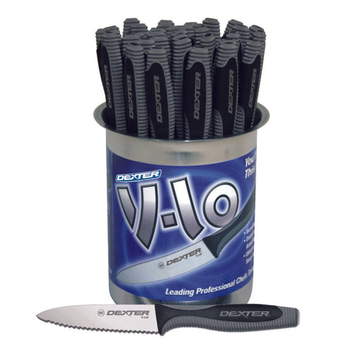 V-Lo® (29463) Paring Knives, 3-1/2", in display bucket, scalloped, DEXSTEEL™ stain-free, high-carbon steel, soft-to-the-touch handle, NSF Certified, Made in USA (36 each per bucket)