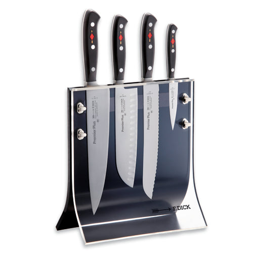 Premier Plus Knife Set, 4-piece, includes: (1) 9" chef's knife (8144723), (1) 7" kullenschliff (hollow edge) santoku (8144218K), (1) 8-1/2" serrated edge bread knife (8103921) and (1) 3-1/2" spear point paring knife (8144709), forged, high carbon stainless steel, plastic handles, complete with (1) 4Knives knife block