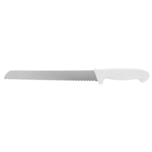 Bread Knife, 10" blade, straight, serrated, stamped, dishwasher safe, high-carbon, stain-resistant, German steel, white polypropylene handle, with SteriShield™ antimicrobial protection, NSF