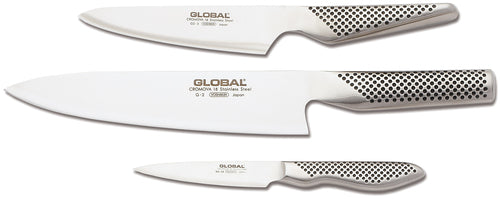 Global Knife Set, includes (1) 5" utility knife, (1) 8" Chef's knife, (1), 3" paring knife, high carbon stainless steel, Made in Japan