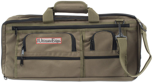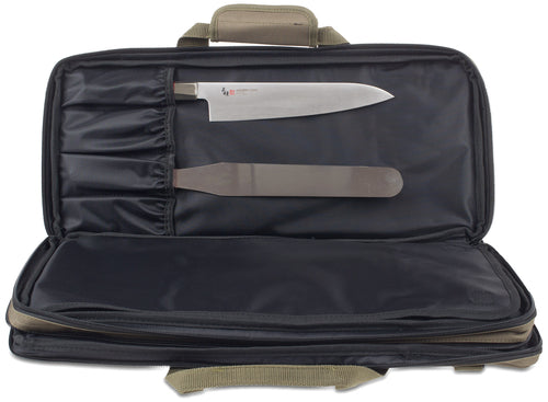 Deluxe Knife Bag, 3-section, 20" x 9"H, holds up to 18 knives, 5 exterior pockets, interior mesh pocket, padded carry handle, includes shoulder strap, PVC laminated polyester, olive green