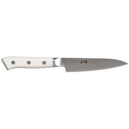 Mcusta Zanmai Pro Utility Knife, 4-3/10", petty-style (spear point), forged, molybdenum/vanadium steel blade, Dupont Corian handles, white, Made in Japan