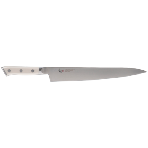Mcusta Zanmai Pro Sujihiki Slicer, 10-3/5", forged, molybdenum/vanadium steel blade, Dupont Corian, white, Made in Japan