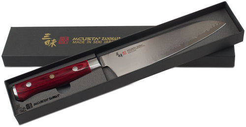 Mcusta Zanmai Damascus Flame Santoku Knife, 7", forged, VG-10 steel blade, pakka wood, red, Made in Japan
