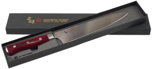 Mcusta Zanmai Damascus Flame Chef's Knife, 8-1/5", stamped, VG-10 steel, pakka wood, red, Made in Japan