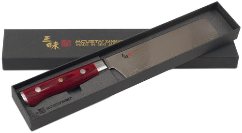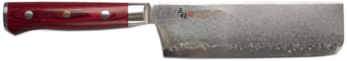 Mcusta Zanmai Damascus Flame Nakiri Knife, 6-1/2", forged, VG-10 steel blade, pakka wood, red, Made in Japan