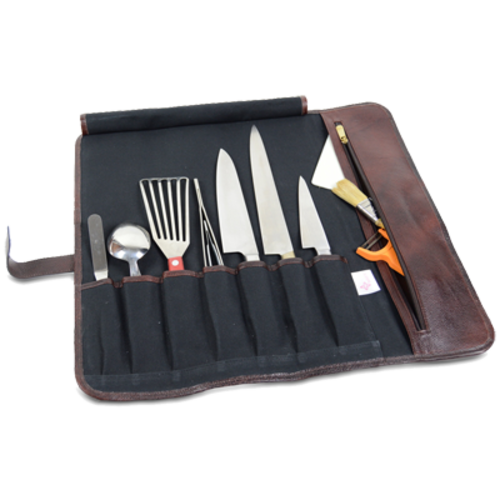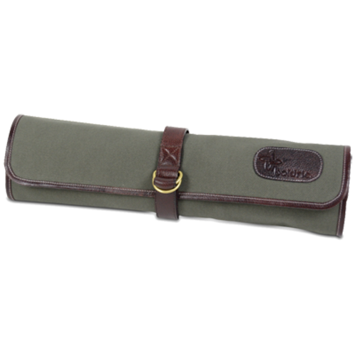 Boldric Knife Roll, 20-1/2"L x 19"W, (8) pocket, consist of: (7) knife pocket, (1) utility pocket with zipper, leather strap with D-ring hardware, canvas, olive green
